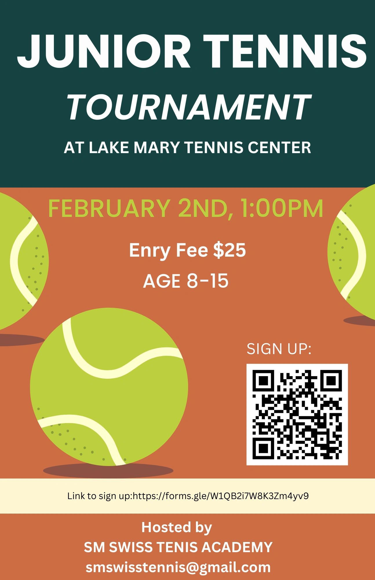 Join us for another Junior tennis tournament. Please scan the QR code to sign up.